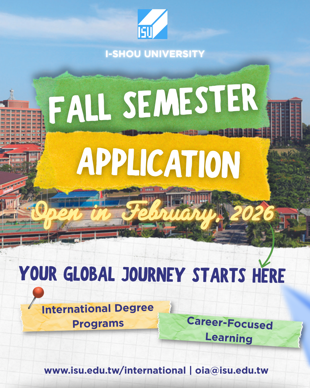 The ISU–NCKU Joint Scholarship Program has been launched, creating a direct pathway for I-Shou University students to pursue Master’s or PhD degrees at National Cheng Kung University (NCKU), one of Taiwan’s most prestigious research institutions. Through this collaboration, eligible ISU-nominated students gain early exposure to advanced research environments, interdisciplinary learning, and faculty mentorship, building a strong foundation for graduate study while still at ISU.