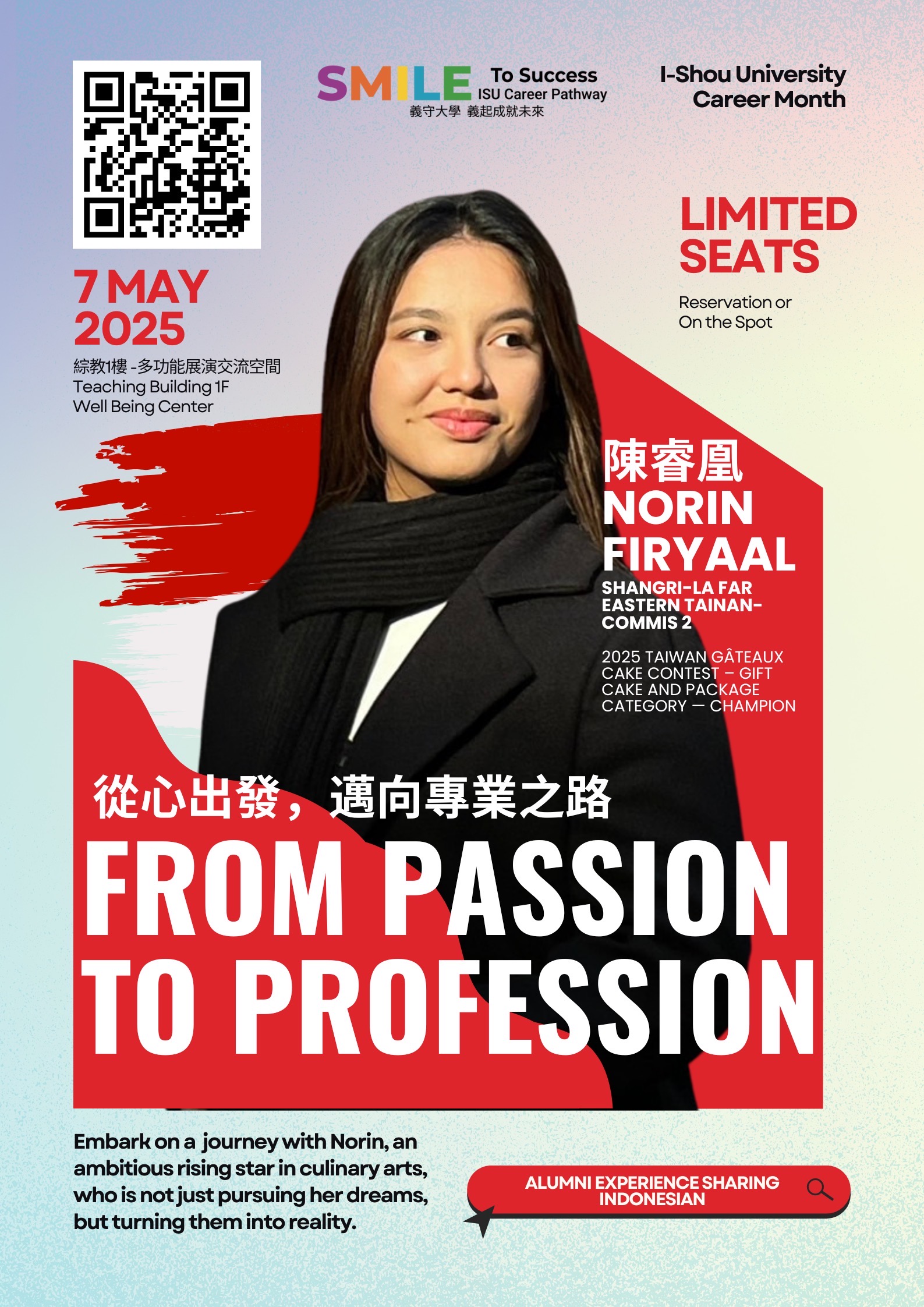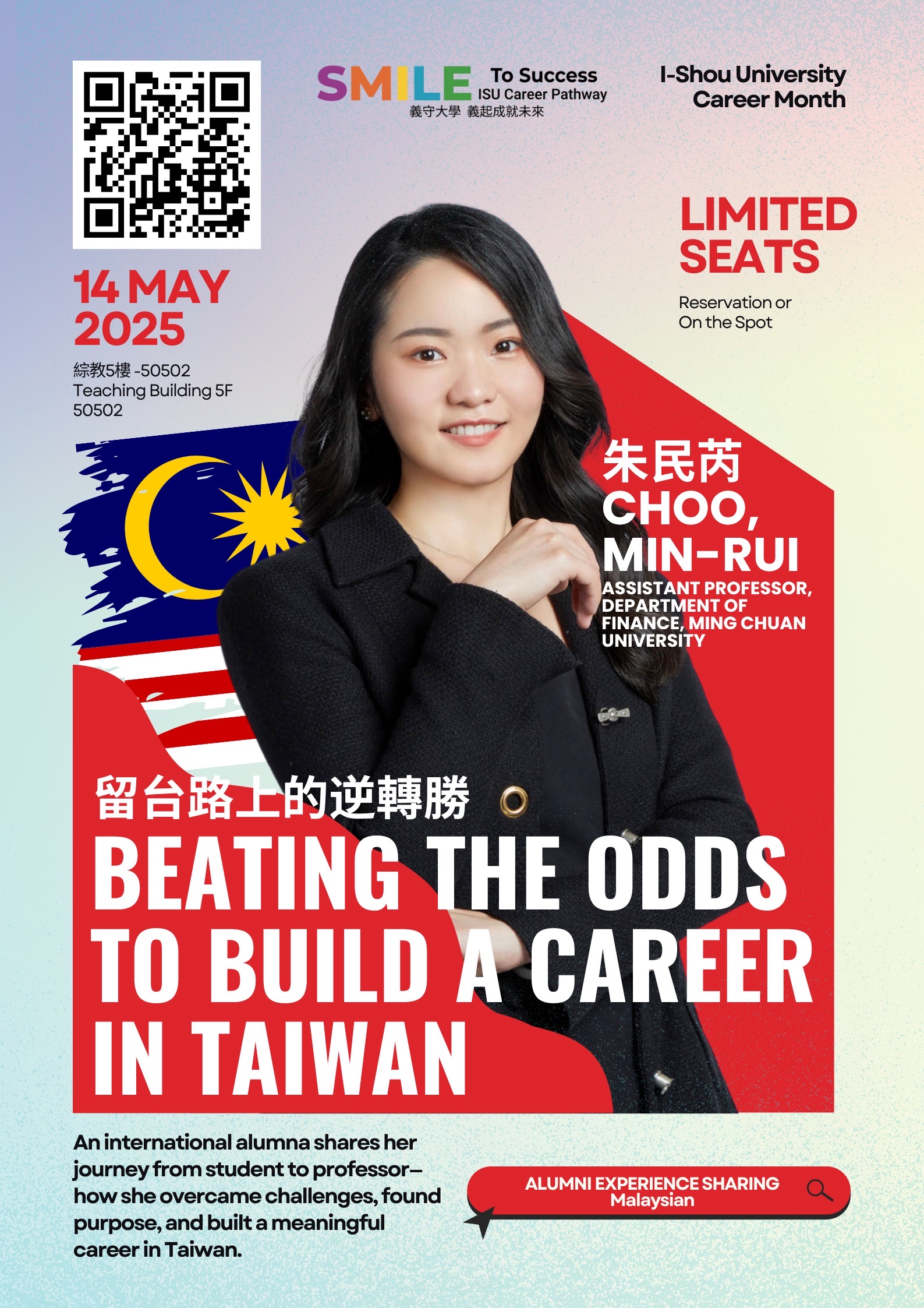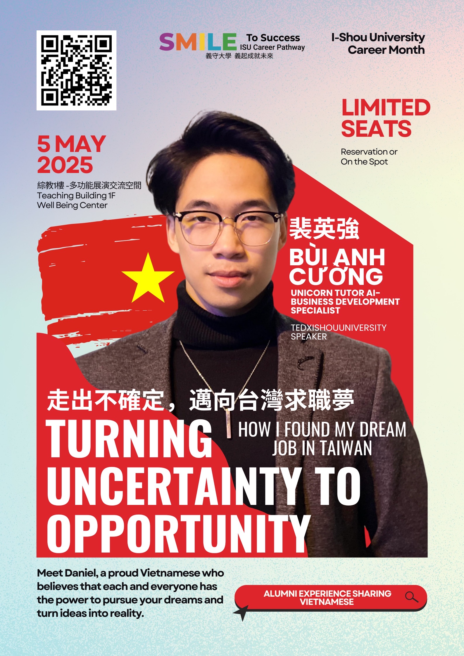 We are excited to unveil an exceptional opportunity designed to empower our students on their journey toward professional success. The ISU SMILE to Success event series is geared towards equipping students with the practical career insights, valuable connections, and essential skills needed to thrive in Taiwan’s dynamic workplace environment.