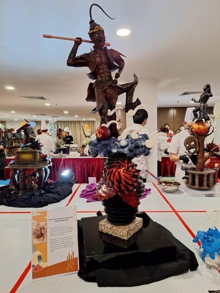 This year’s 2024 Battle of the Chefs (BOTC) in Penang, Malaysia, is a biennial international culinary competition recognized as a prestigious B-grade event by the World Chef Association (WACS). The team from ISU, consisting of faculty members and students, used the legendary figure Sun Wukong from the Chinese mythological classic Journey to the West as their main character. They masterfully applied chocolate craftsmanship to vividly depict Sun Wukong. The lifelike sculpture featured Sun Wukong holding his golden cudgel and standing on a cloud, astonishing the audience. The golden cudgel symbolizes the defense of law, while the specially designed fireball beneath his feet represents the passionate pursuit of justice. Despite the challenges posed by Malaysia’s tropical climate, the ISU team successfully completed this magnificent piece, standing 140 cm tall and weighing 30 kg.
