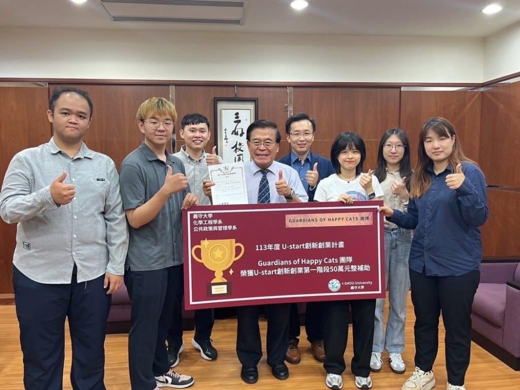 The team titled Guardians of Happy Cats in the Innovative Services category, guided by Dr. Ming-Chia Hsieh, the Director of the Center for Innovation and Incubation, and Dr. Chia-Jung Cho, the Director of the Sustainable Development Research Center, consists of Ting Chen, Shih-Yu Lin, Kuan-Yu Chen, and Hsuan-Kai Lin of the Department of Chemical Engineering in the College of Engineering and Hui-Chun Huang of the Department of Public Policy and Management in the College of Management. This year, the team received NT$500,000 in the first phase of the U-start Plan for Innovation and Entrepreneurship’s startup grant. Recognizing the increasing demand for pet companionship in an aging society, the team aims to achieve environmental sustainability and establish a friendly green cycle. They transform agricultural waste, specifically rice husks, into eco-friendly pet products. Their patented process ensures that the rice husk-based cat litter has excellent water absorption and odor reduction capabilities, addressing the issues associated with traditional cat litter. This innovation provides pet owners and their furry friends with a cleaner living environment.