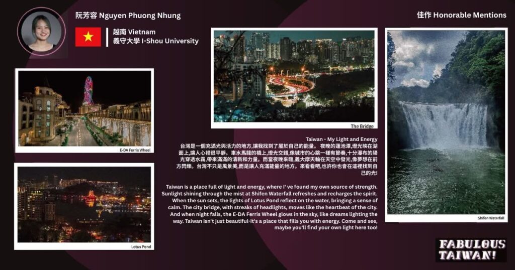 Photography followed the same pattern. What might have seemed a casual hobby became a practice in patience, observation, and refinement. Days spent capturing shots, waiting for the right light, experimenting with composition. Again, her Honourable Mention in the 13th Fabulous Taiwan! Photography wasn’t just luck.