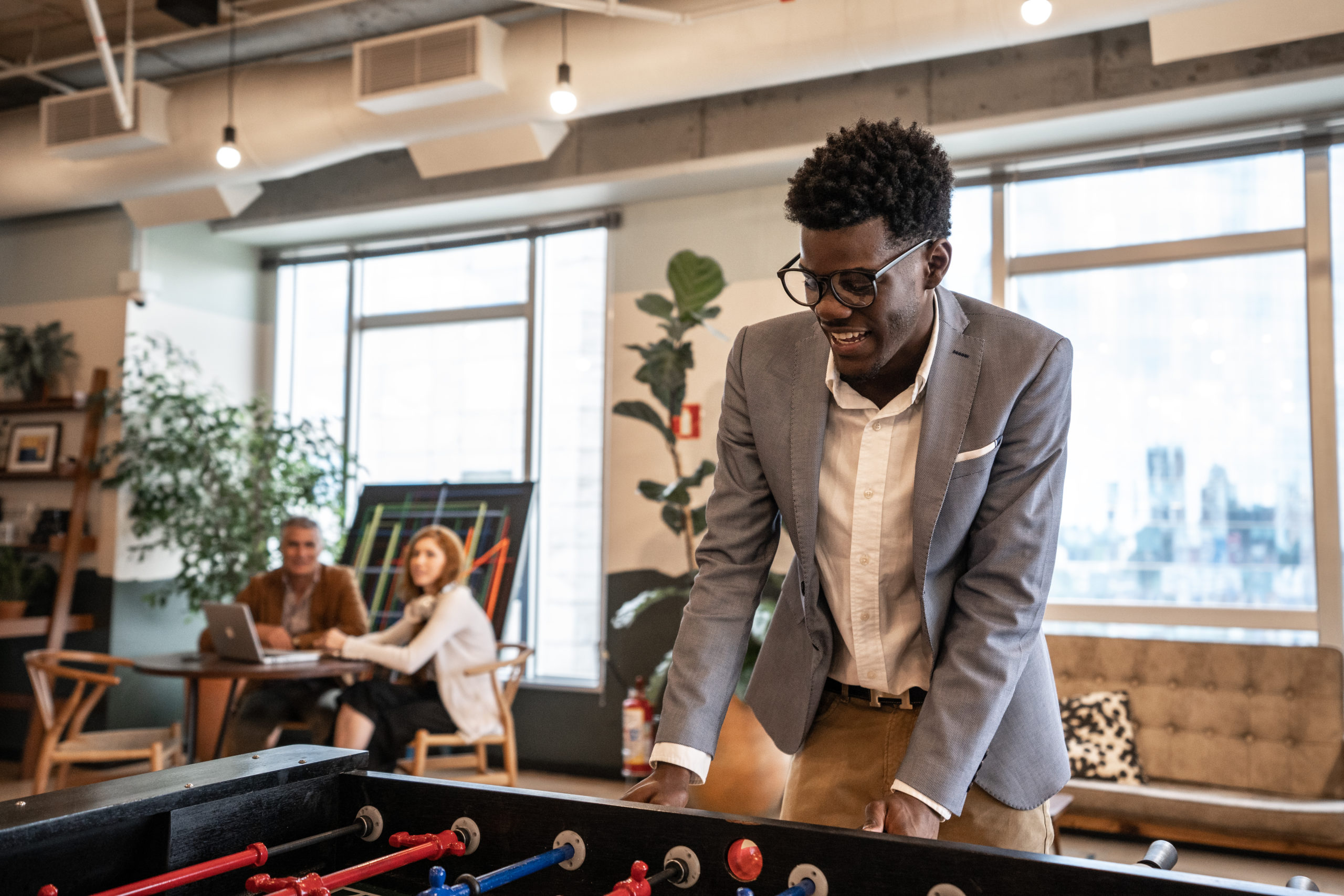 Young healthy woman and man practicing yoga on fitness class background, Harmony, balance, meditation, relaxation, healthy lifestyle concept news_397 Young businessman playing foosball at coworking Original size is 2560 × 1707 pixels